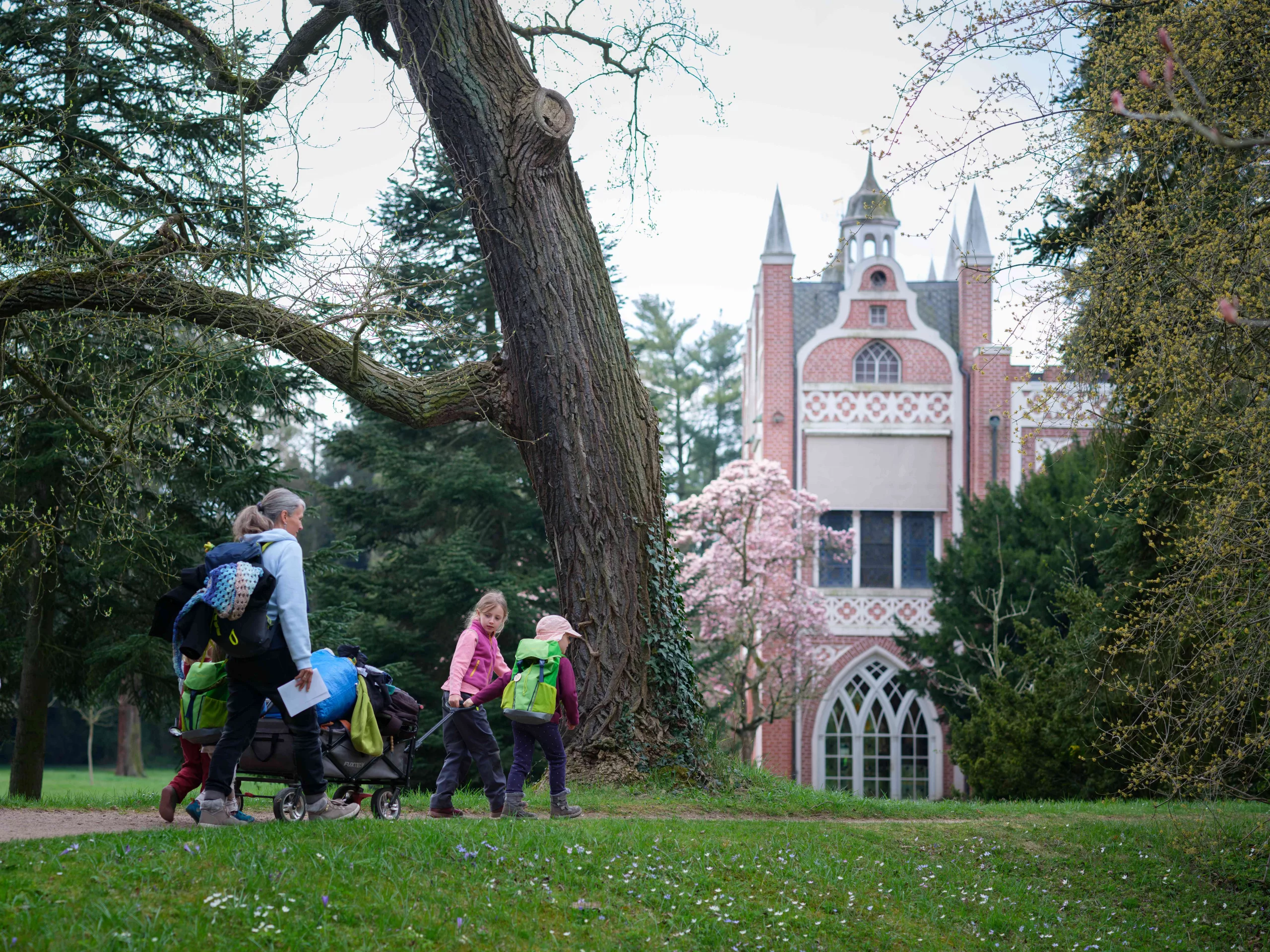 Mit einem Entdeckerrucksack geht es gemeinsam mit Pavo, dem Pfau, auf eine Detektivtour rund um das Gotische Haus. Im Rucksack befinden sich eine Detektivausrüstung, ein Entdeckerheft mit kurzen Geschichten zum Vorlesen sowie kreativen Aktionen und Aufgaben. Das Gotische Haus ist dabei sowohl Start- und Endpunkt der Tour als auch Entleihstation für die Entdeckerausrüstung. Ist die Tour erfolgreich absolviert, wartet ein Sticker mit Pfau auf die Gartendetektive. Interessierte Familien können die Rucksäcke gegen eine Leihgebühr von fünf Euro zu den Öffnungszeiten des Gotischen Hauses entleihen und individuell nutzen.