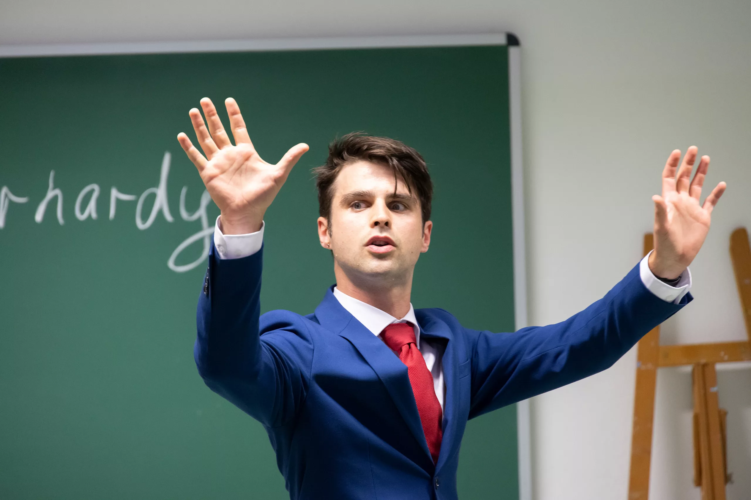Lieber versichert als verunsichert – das ist das Lebensmotto von Eric, dem jungen, redegewandten Versicherungsvertreter des Vertrauens, dessen Mission der Kampf gegen das Unvorhergesehene in einer Welt der Krisen, Kriege und Katastrophen ist. Doch heute wartet ein besonderer Termin auf den sonst so sicher auftretenden Policen-Jongleur mit Aktenkoffer und Schlips: Von seinem Arbeitgeber wird er in eine Schule geschickt, um im Klassenzimmer Risikoaufklärung im Kampf gegen den schicksalhaften Konjunktiv zu betreiben.