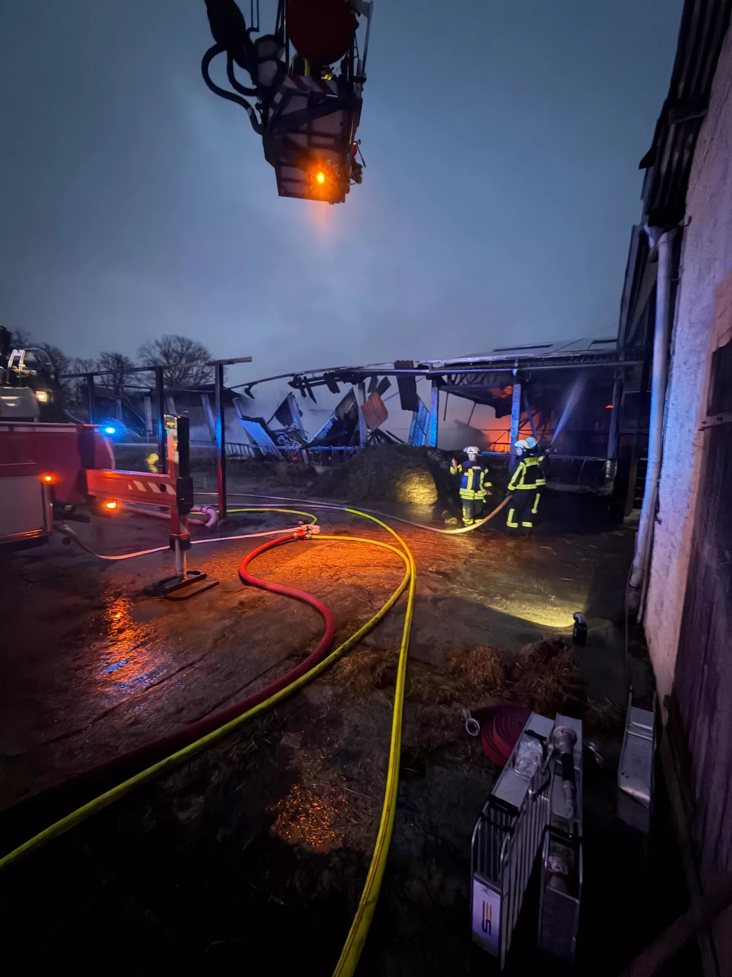Bereits auf der Anfahrt stellten die ersten Einsatzkräfte eine starke Rauchentwicklung fest. Vor Ort bestätigte sich die Lage: Eine rund 80 mal 25 Meter große Halle stand in Vollbrand und war in Teilen bereits eingestürzt. Menschen oder Tiere befanden sich nach ersten Erkenntnissen nicht in unmittelbarer Gefahr.