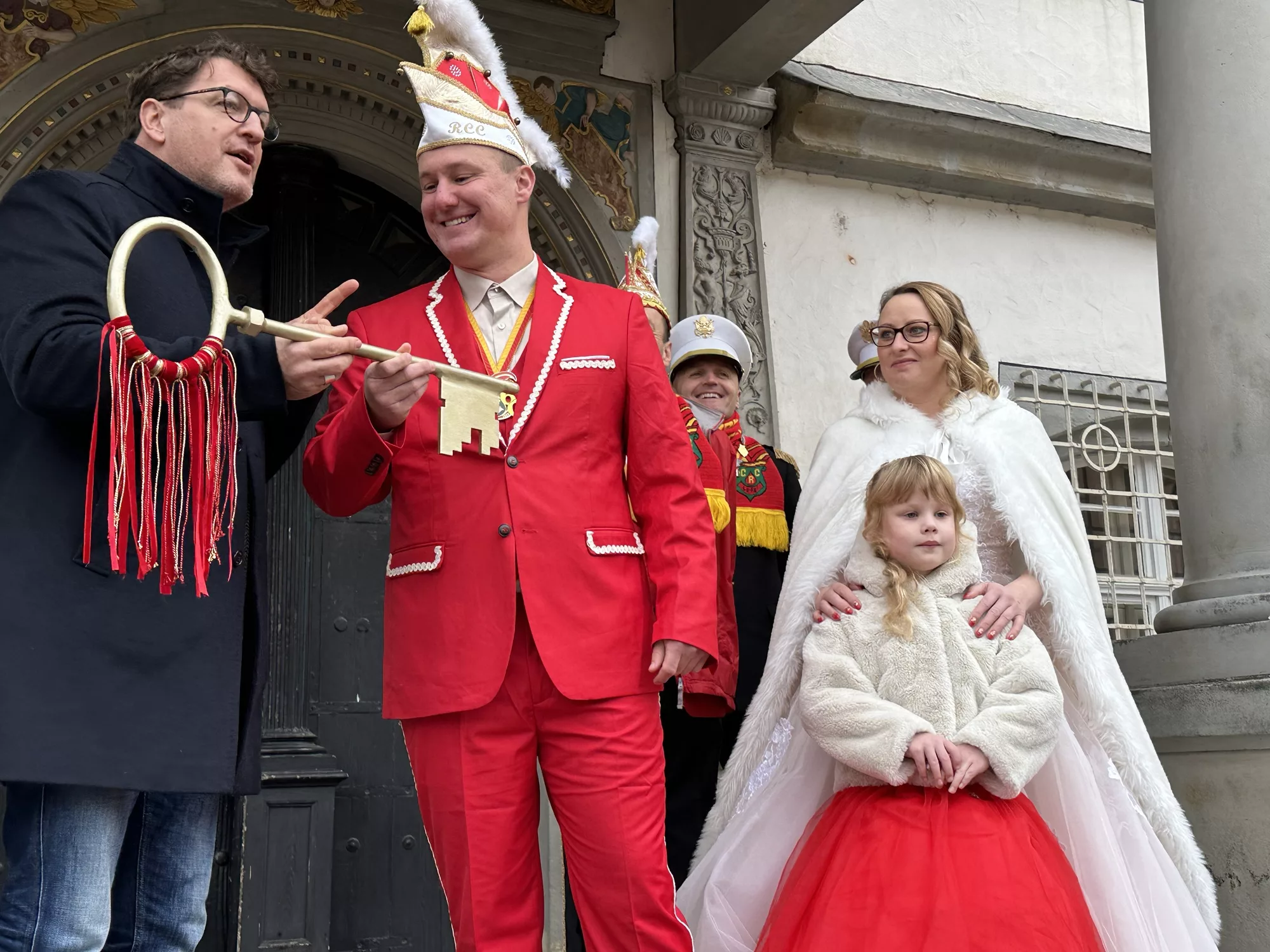 Mit Schere bewaffnet machte sich das närrische Volk an die Krawatte des Oberbürgermeisters – und wie es sich gehört, wurde der Schlips kurzerhand abgeschnitten. Wenige Minuten später, um exakt 11.11 Uhr, übergab Zugehör dem frisch gekrönten Prinzenpaar, Prinzessin Elisabeth und Prinz Philip, den symbolischen Stadtschlüssel.