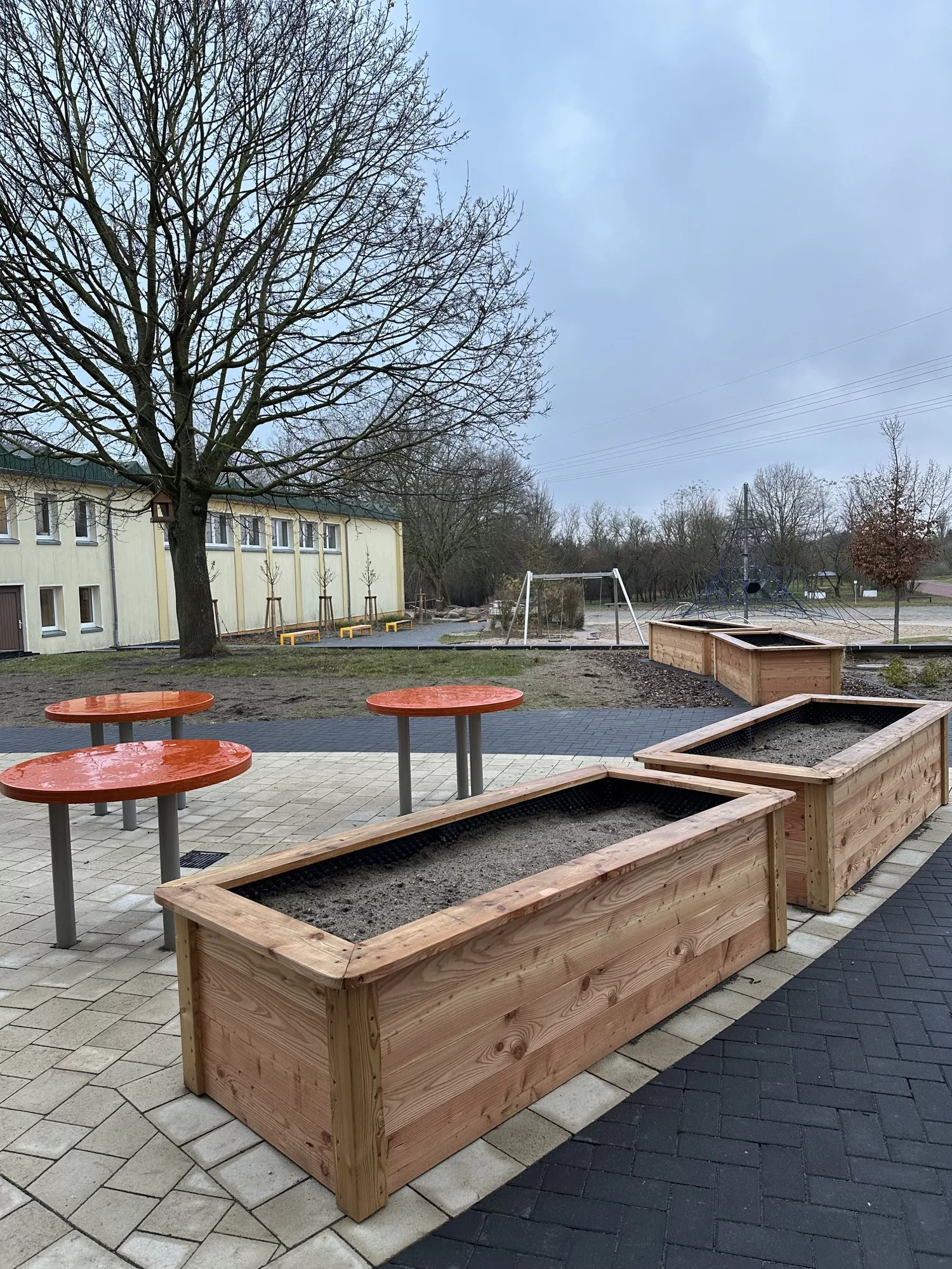 Ein zentraler Blickfang ist das neue Holzpodest, das mit Sonnensegeln überspannt ist. Ergänzt wird die Anlage durch Hochbeete und Tische für den Schulgartenunterricht sowie ein Großfeldschachspielfeld. Sitzlandschaften, Hockerbänke mit Aufbewahrungsboxen und sanierte Stützmauern runden das Angebot ab. „Je vielfältiger die Bewegungsangebote, desto besser können die Sinne der Kinder geschult werden“, heißt es aus der Stadtverwaltung.