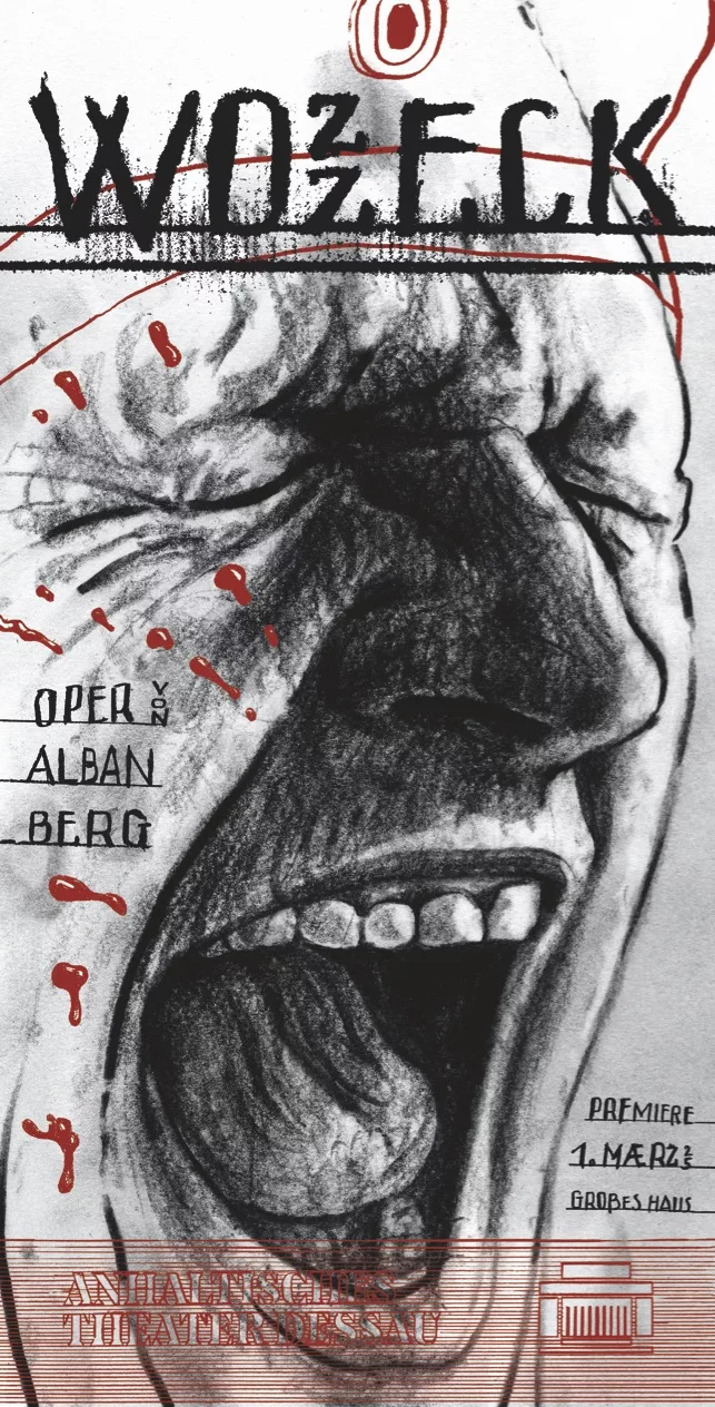 15 Szenen, jede in einer eigenen musikalischen Form komponiert, für den Zuhörer aber kaum wahrnehmbar. Formen, die die Musik unterdrücken, die ihrerseits neue Wege schafft, sich zu befreien und somit die Dramatik des Bühnengeschehens zu erzählen. Mit neuen Klangfarben und komplexen Rhythmen nutzt Berg alle zu seiner Zeit verfügbaren musikalischen Mittel, um ein expressionistisches soziales Drama zu zeichnen, das die Figuren auf der Bühne von der ersten Szene bis zum Ende drängt und den Zuschauer überwältigt. Plakat: ©Robert Voß