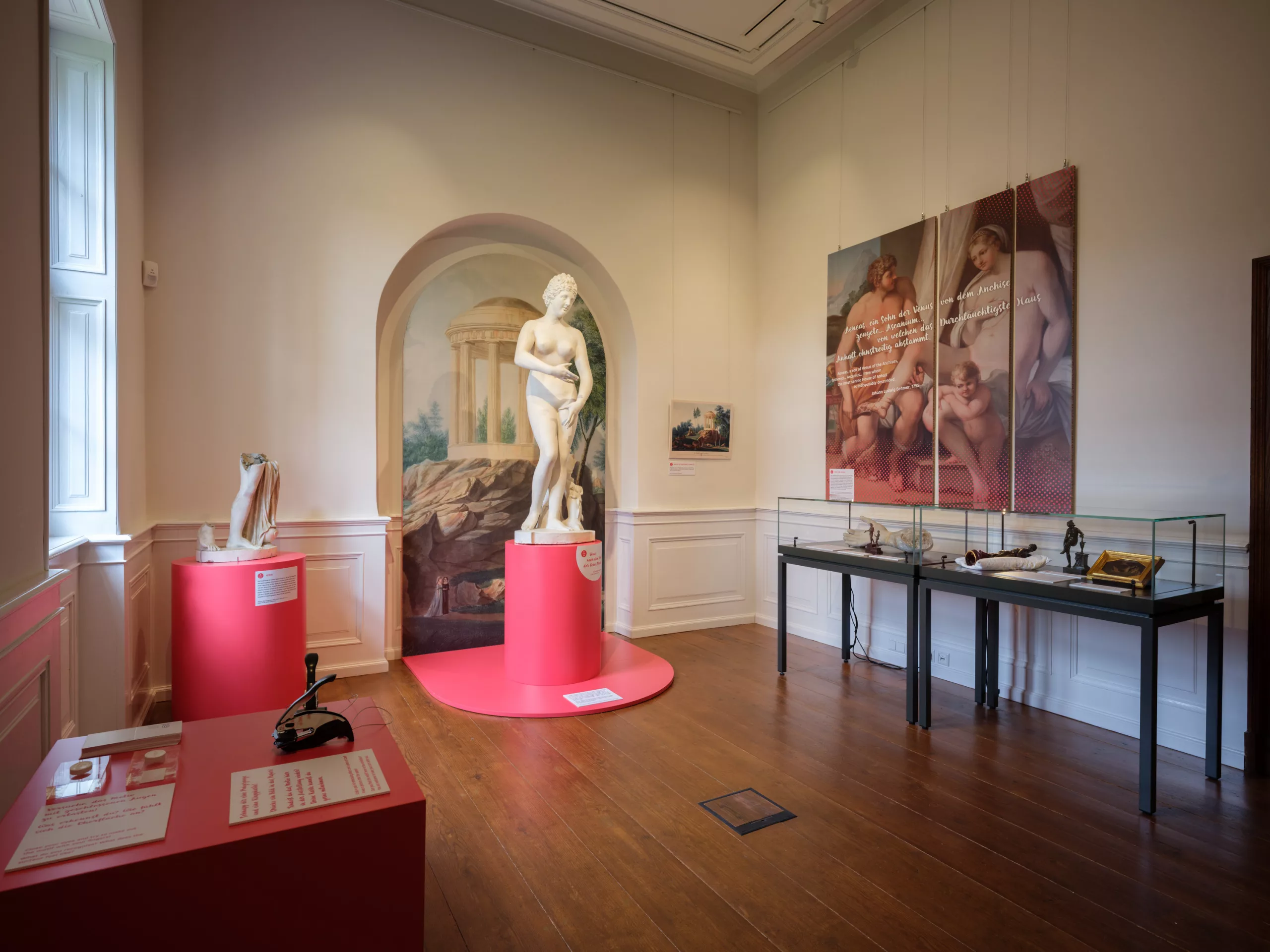 Fragen wie Was macht eigentlich der Bergmann über dem Nymphaeum? Warum ließ sich Fürst Franz wie Apollo porträtieren und warum begegnet man der Göttin Venus im Wörlitzer Park an jeder Ecke? werden in der Ausstellung beantwortet. Zugleich aber fordern Schlüsselobjekte dazu auf, in den winterlichen Garten zu gehen, um sich die von der Antike inspirierten Tempel und Bildwerke in den landschaftlichen Anlagen mit frischem Blick anzuschauen. Dies kann mit Hilfe von in der Ausstellung gesammelten Postkarten und einem analogen Parkplans geschehen oder auch digital per App. Foto: ©KsDW/Lars Reimann
