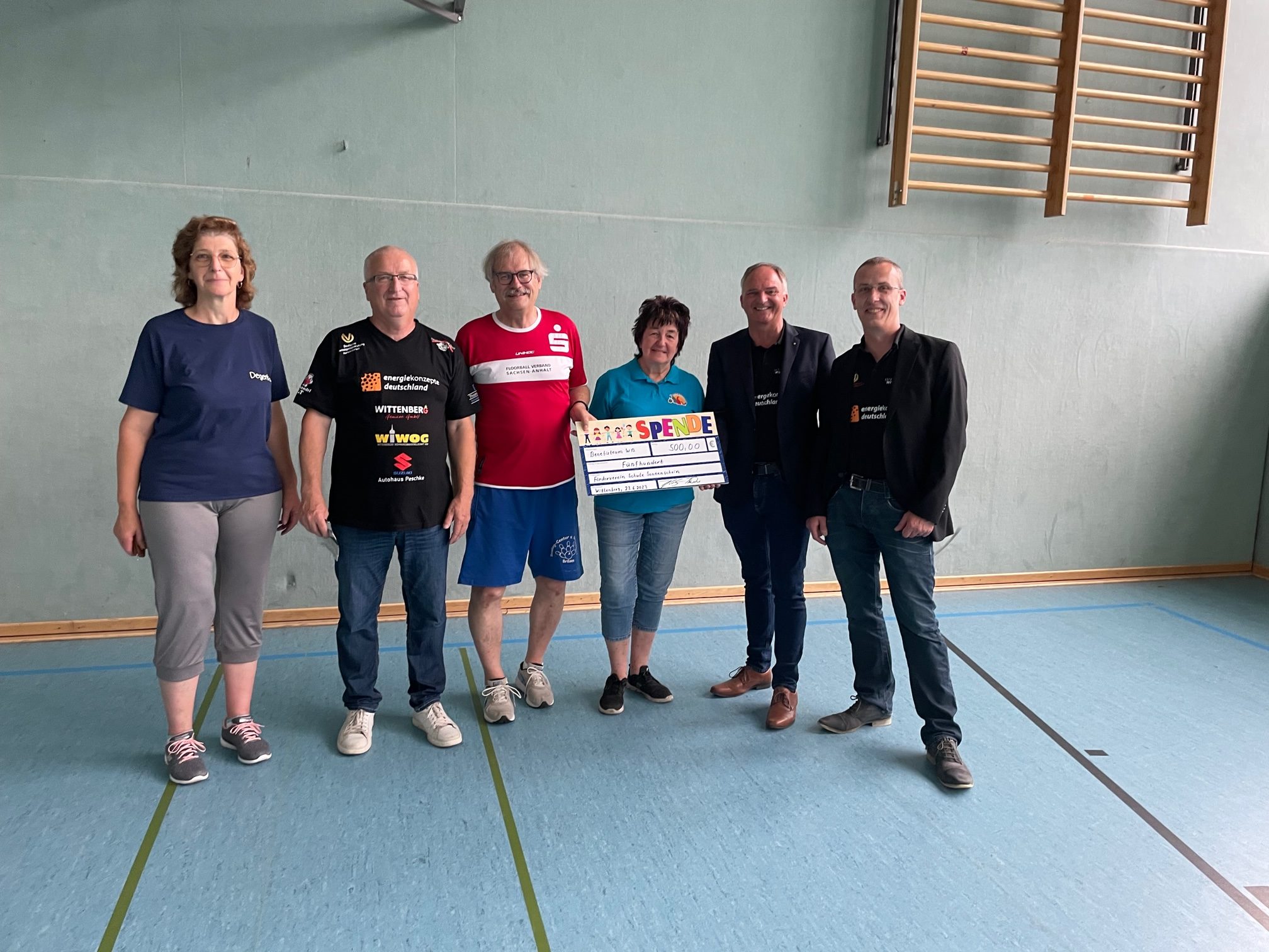 Wittenberg (md). Das Benefizteam Wittenberg überreichte dem Förderverein der Schule für Geistigbehinderte „Sonnenschein“ einen Spendenscheck in Höhe von 500 Euro. Das Geld soll für die Anlage von Hochbeeten im Schulgarten verwendet werden. Der Erlös wurde beim Fußballspiel des Benefizteams gegen die Traditionself des SV Seegrehna 93 am 26. Mai des Jahres im Gebrüder Grabsch Waldstadion erzielt: Das Benefizteam gewann souverän mit 6:1 Toren. Den Scheck überreichten Ralph Hörentrup (r.), Thomas Popp (2.v.r.) und René Stepputtis (2.v.l.) an den Vorstand des Fördervereins.