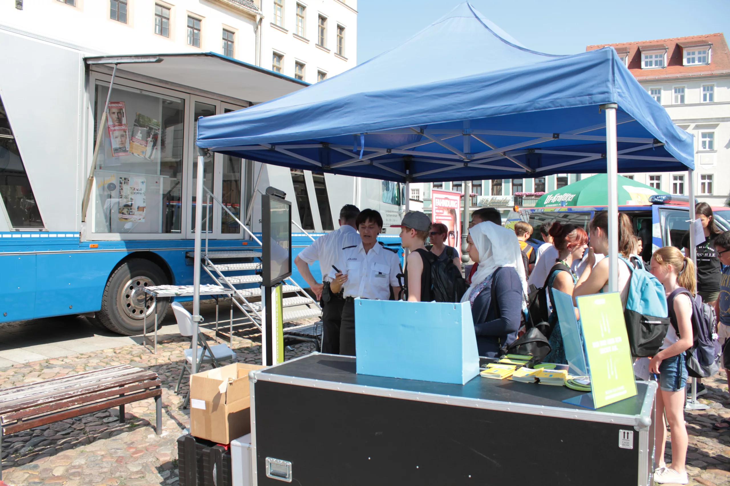 Bild: Infostand des Polizeireviers Wittenberg, dahinter das Präventionsmobil des Landeskriminalamtes. Foto: Wolfgang Gorsboth