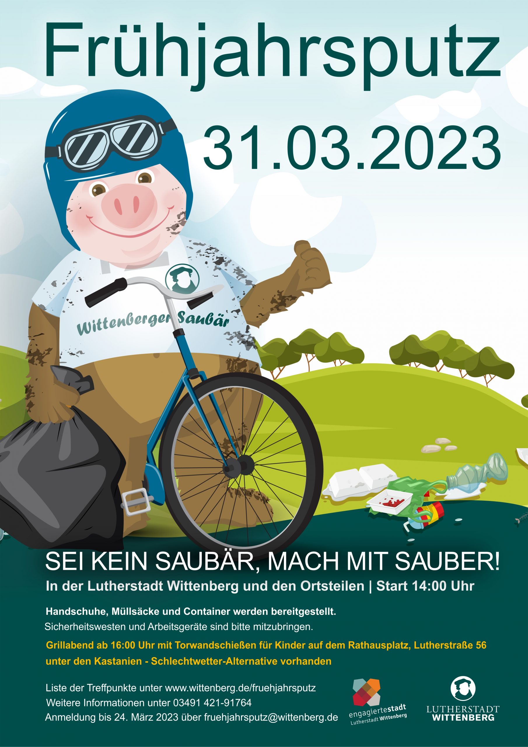 Wittenberg (md). Alle Wittenberger sind wieder aufgerufen, sich am Freitag, dem 31. März 2023, um 14 Uhr an der diesjährigen Frühjahrsputzaktion „Sei kein Saubär, mach mit sauber!“ in Wittenberg und in den Ortsteilen zu beteiligen. Alle, die mitmachen möchten, können sich bis zum 24.03.2023 per E-Mail an fruehjahrsputz@wittenberg.de anmelden. Weitere Informationen sind auch telefonisch unter 03491/421-91 764 sowie auf der städtischen Internetpräsenz www.wittenberg.de/fruehjahrsputz zu erhalten.