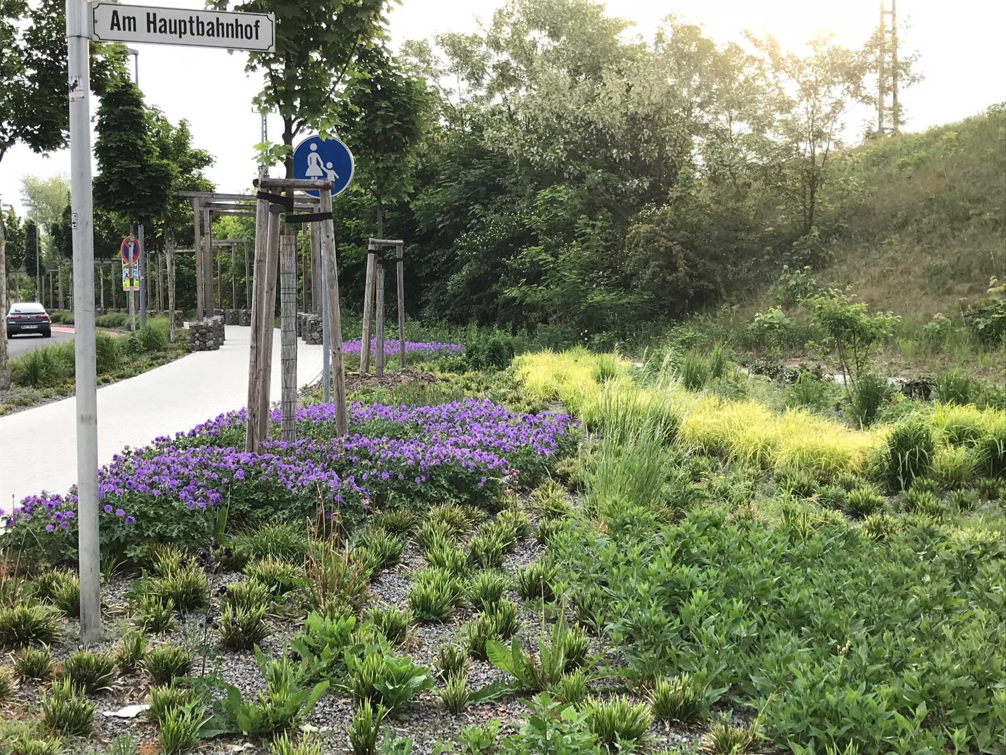 Bild: Üppig gewachsene Staudenpflanzung in mineralischem Mulch an der Bahnhofspromenade. Foto: Stadtverwaltung
