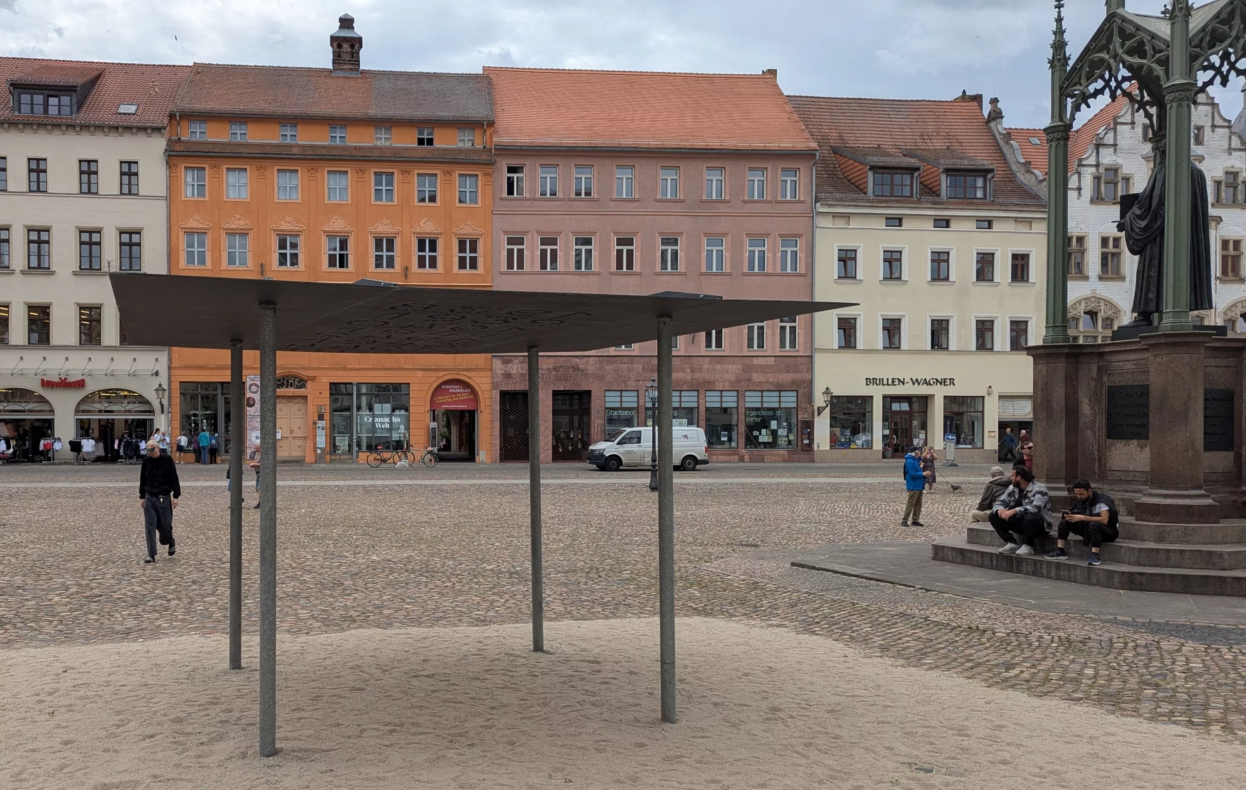 Die Skulptur ist ein Pavillon mit feinen Bohrungen im Dach. Wer sich bei Sonnenschein in den Schatten des Pavillons stellt, kann durch die Schattenwürfe die Jahreszahlen 1938 bis 1945 und auf seiner Haut einzelne Punkte erkennen. Die Skulptur erinnert an den 80. Jahrestag des Kriegsendes und das Ende des Holocaust. Die Stadtkirchengemeinde Wittenberg begleitet die Aufstellung von „Restlicht“ mit dem Gedicht der Woche: Jeweils für eine Woche wird das Gedicht einer jüdischen Schriftstellerin oder eines jüdischen Schriftstellers bei der Gedenkskulptur zu finden sein. „Das Gedicht bringt seine Stimme mit ein in die Betrachtung des Kunstwerks“, sagt Dr. Kasparick. Der Wechsel der Gedichte erfolgt donnerstags beim Stadtgebet – am darauffolgenden Freitag kann das neue Gedicht an der Skulptur gelesen werden. Foto: W. Gorsboth
