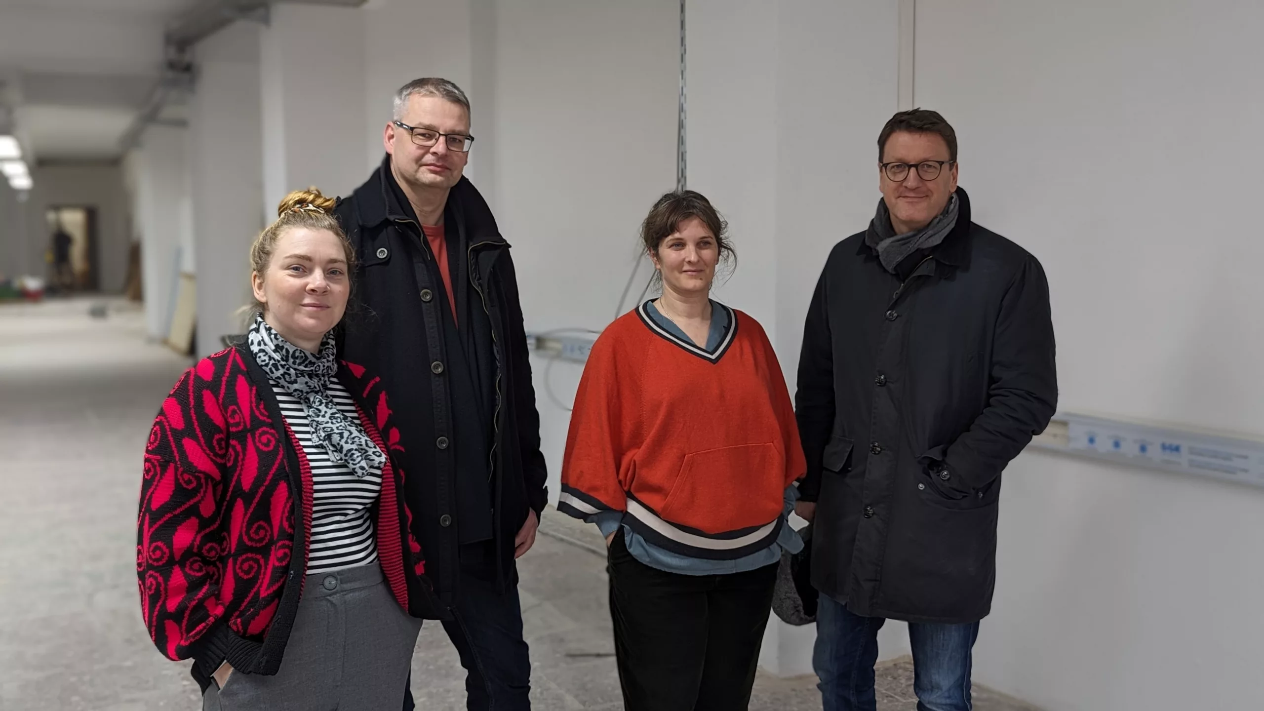 Bild (v.r.n.l.): Oberbürgermeister Torsten Zugehör, Ivana Rohr (Endboss), Jean Kammer, Fachbereichsleiter Stadtentwicklung und Lin Franke (Endboss) im StadtLabor, welches derzeit noch eine Baustelle ist. Foto: Wolfgang Gorsboth