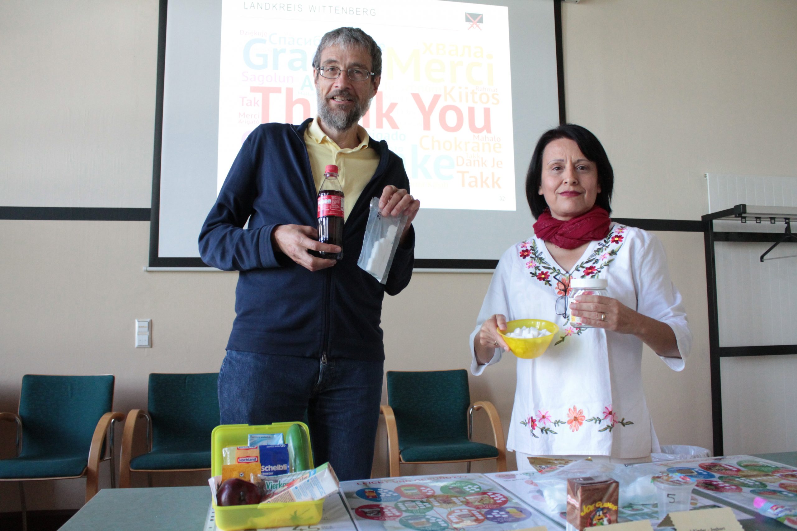 Bild: Amtsarzt Dr. Michael Hable und Zahnärztin Alma Bartlick zeigen ein beliebtes Erfrischungsgetränk sowie einen Brotaufstrich – und die ungesunde Riesenmenge Zucker, die in beiden Produkten steckt: Im Falle des Brotaufstrichs sind es 78 Stück Würfelzucker. Foto: Wolfgang Gorsboth
