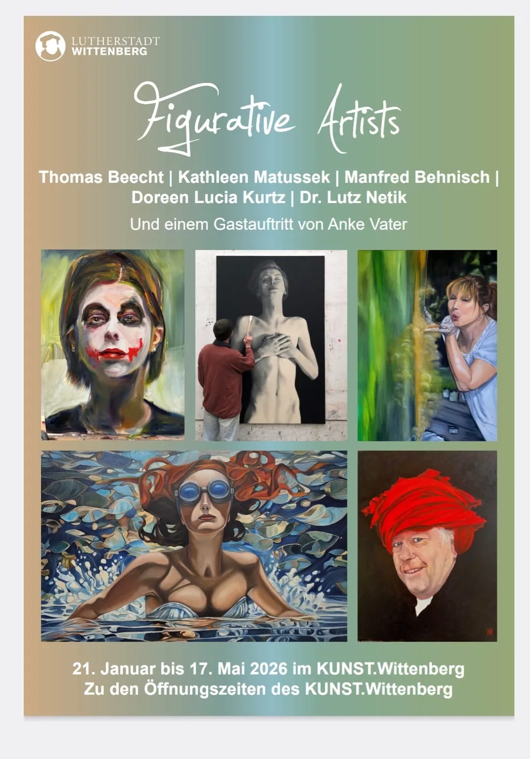 Wittenberg (md/aw). Bürgermeister André Seidig eröffnet am 20. Januar um 18 Uhr im Alten Rathaus (KUNST.Wittenberg) die neue gemeinsame Ausstellung unter dem Titel „Figurative Artists“. Präsentiert werden Werke des renommierten Künstlers Thomas Beecht und seiner Kunstschülerinnen und -schüler: Kathleen Matussek, Manfred Behnisch, Doreen Lucia Kurtz und Dr. Lutz Netik. Die Vernissage wird musikalisch begleitet und bietet den Besucherinnen und Besuchern die Gelegenheit, die vielfältigen Ausdrucksformen zeitgenössischer figurativer Malerei zu erleben.