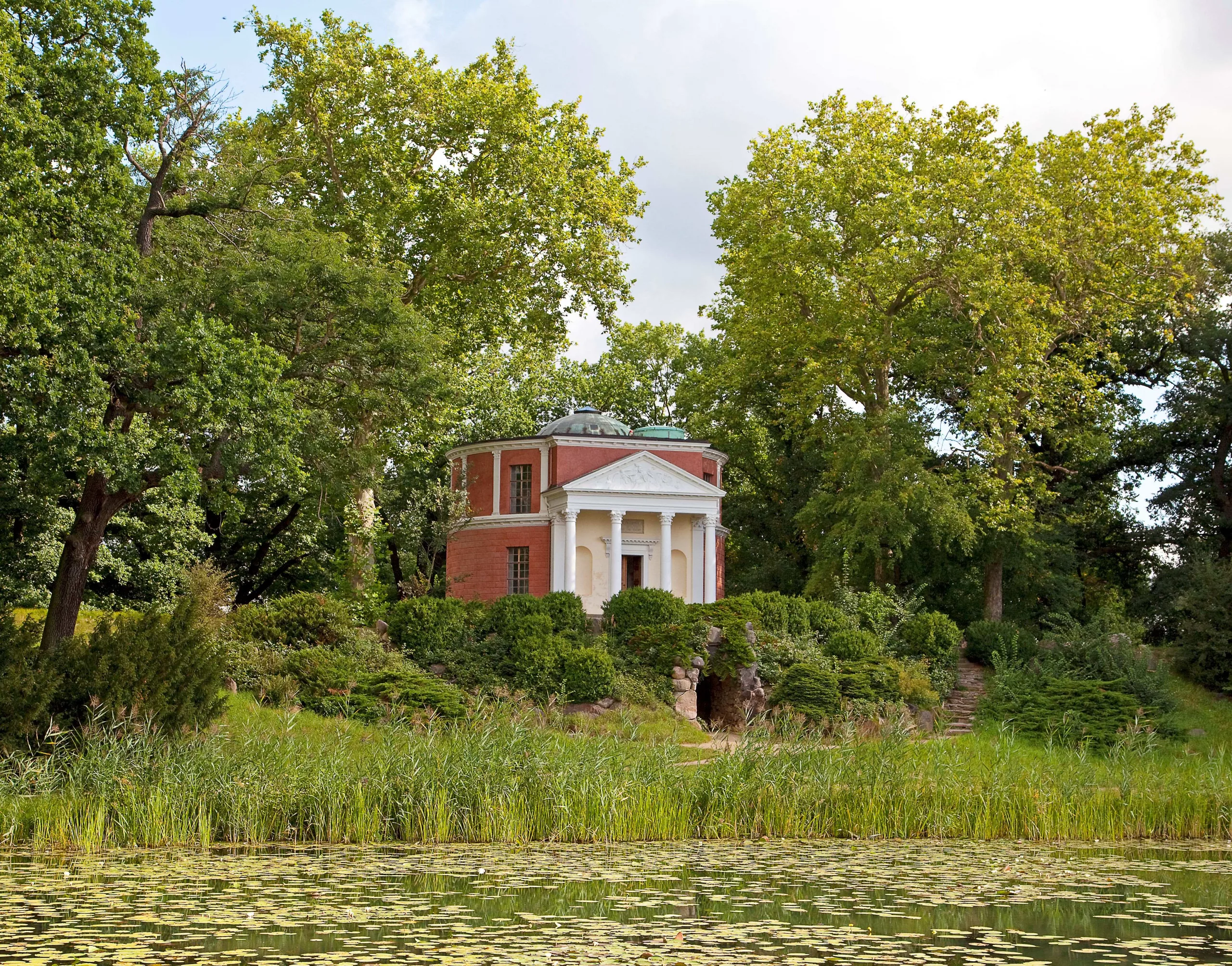Am Rande des großen Wallochs gelegen, erhebt sich das 1795 bis 1797 errichtete Pantheon auf dem Elbdeich (siehe Foto). In seiner äußeren Gestaltung thematisiert es den Konflikt zwischen Natur und Kunst, der durch die Wissenschaft geschlichtet wird. Im Inneren beherbergt es eine Gruppe antiker Plastiken sowie ägyptische Reliefs im Kellergeschoss. Beide Denkmäler können von 11 bis 16 Uhr besichtigt werden.