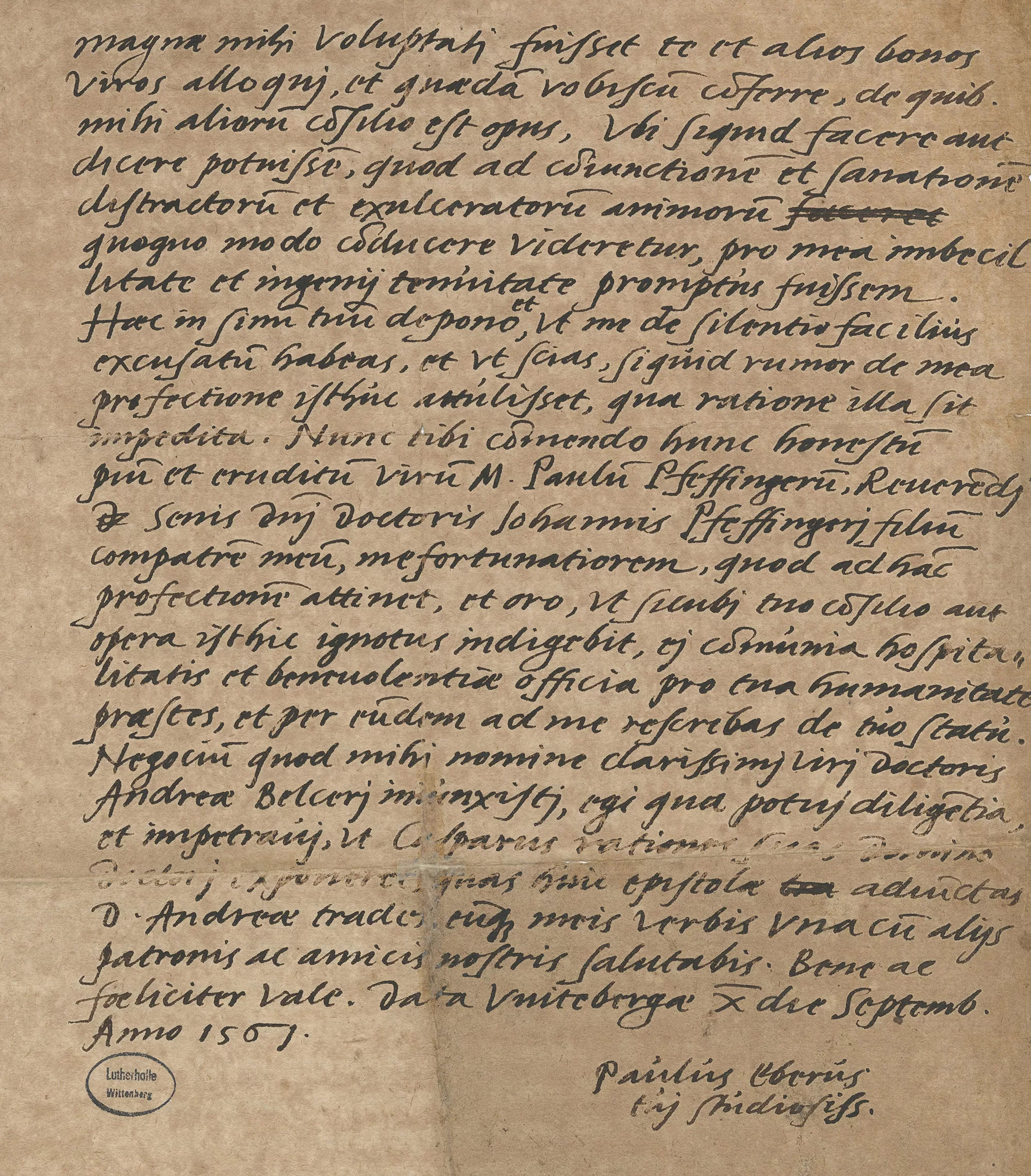 Bild: Schreiben des Reformators Paul Eber (1511-1569) vom 10. September 1561 an einen unbekannten Empfänger. Bei dem Autograph handelt es sich mit hoher Wahrscheinlichkeit um ein geraubtes Objekt. Die Lutherhalle hat es im Oktober 1944 beim Berliner Antiquariat J. A. Stargardt erworben. Foto: Stiftung Luthergedenkstätten in Sachsen-Anhalt