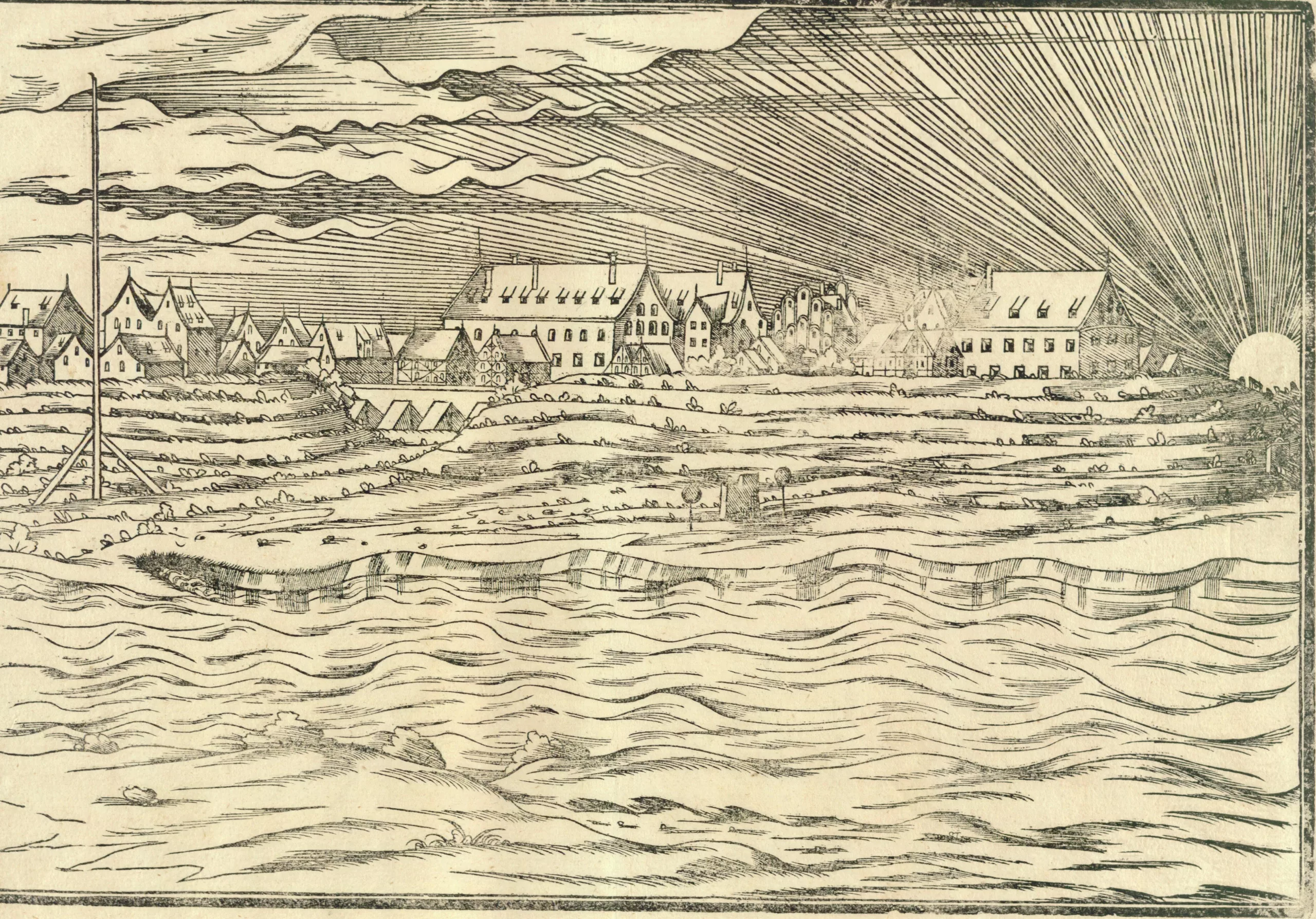 Bild: Teil einer Ansicht der Stadt Wittenberg von Lucas Cranach dem Älteren (um 1536-1546). Im Osten geht die Sonne auf und strahlt symbolträchtig über das Universitätsgebäude und das Schwarze Kloster, in dem Martin Luther lebte und wirkte. Quelle: Stiftung Luthergedenkstätten in Sachsen-Anhalt