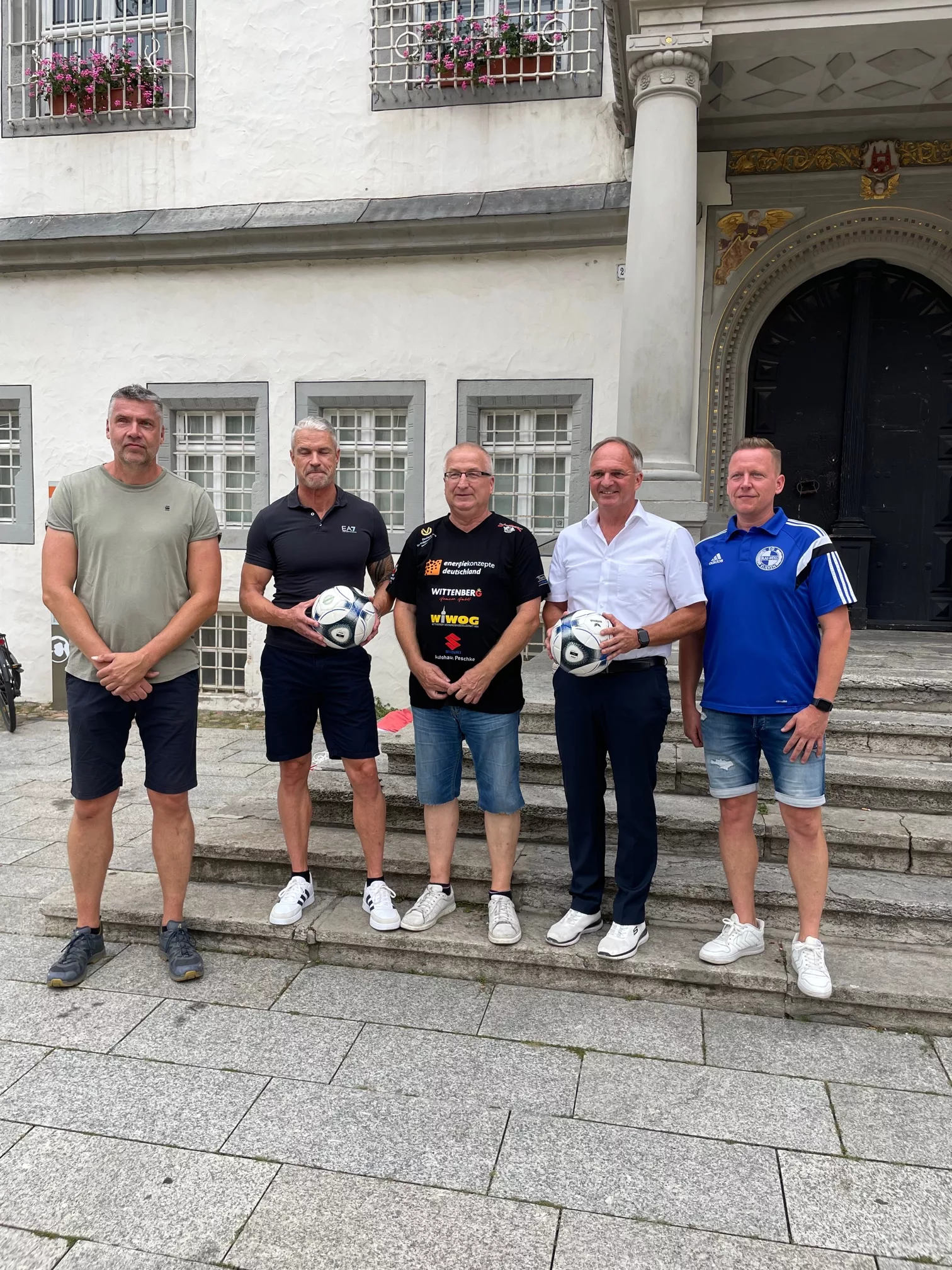 Bild: Michael Kirk, Dirk Novotny, René Stepputtis, Thomas Popp und André Stolz (v.l.n.r.) freuen sich auf das Fußballspiel in Klieken. Foto: privat