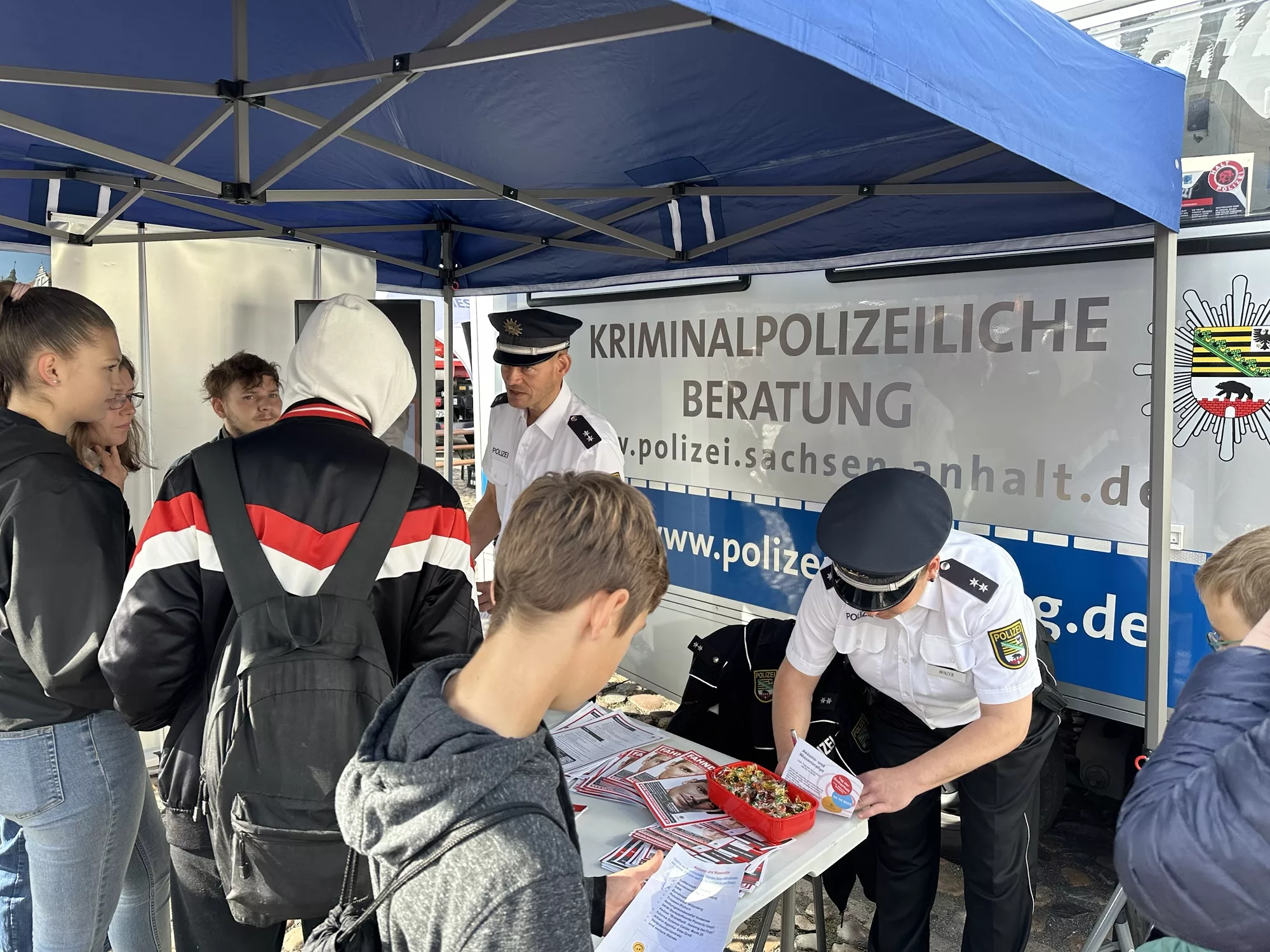 Polizeibeamte klären beim Tag der Sicherheit auf dem Wittenberger Marktplatz über Prävention und Cyberkriminalität auf – für junge Menschen ein wichtiges Thema.